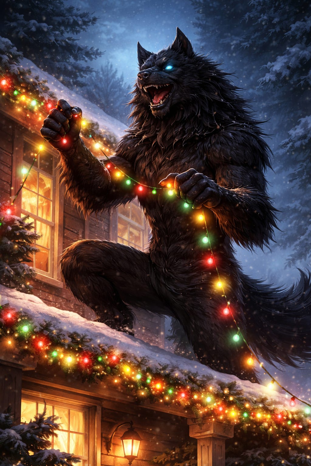 (I asked ChatGPT for this image, described it…and it spat out a written tiny story that contained some hilarious things that I will definitely make use of. (Shouldn’t have to say this, but no, not letting it write for me. For one, it doesn’t write LIKE me and two, it doesn’t fit within my world as it mingled other things into it that aren’t present. I just liked the nudge of a funny suggestions) More of, it gave me an idea of the dumb antics he would go through to share his seasonal spirit. Then I remembered I forgot to tell it to illustrate. :D)