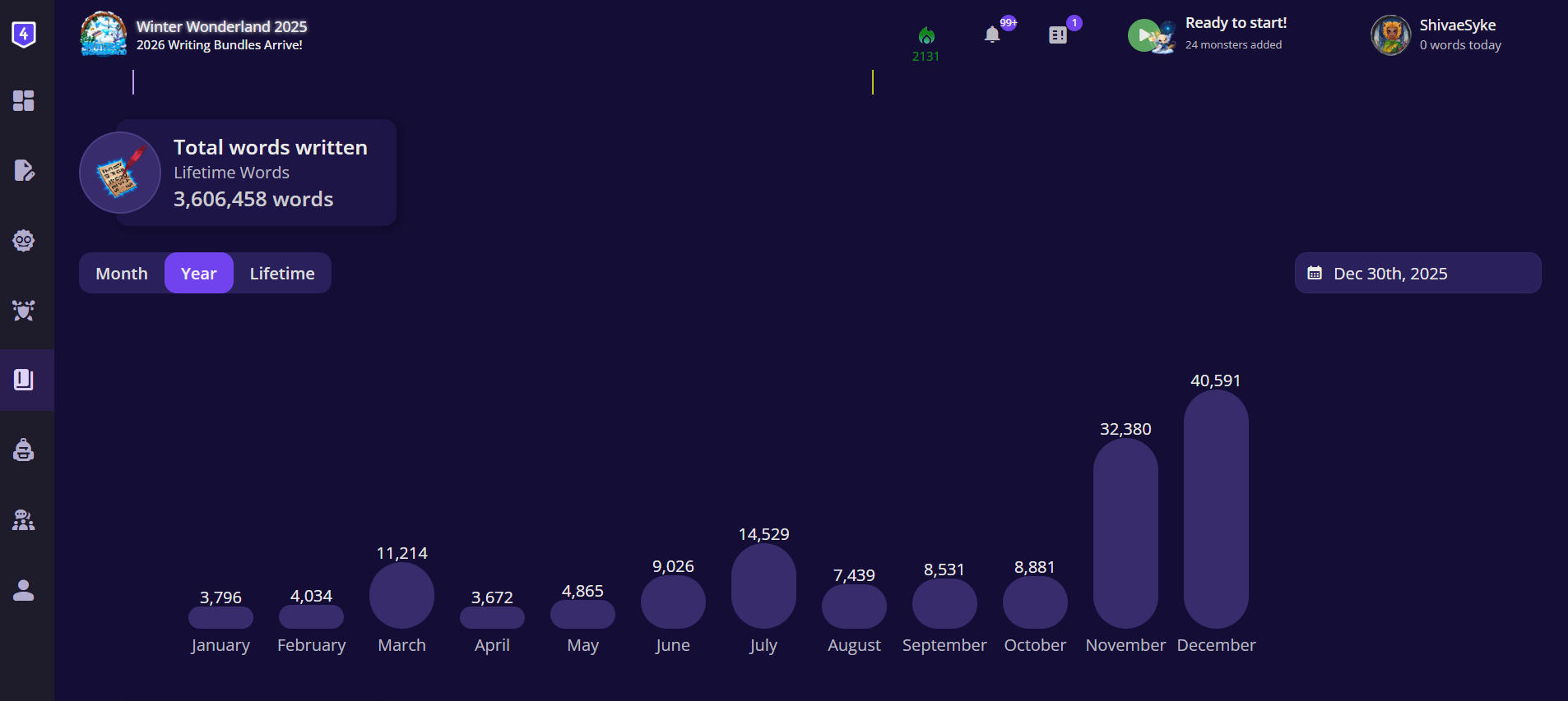It’s taken me almost an entire year to get here. I FINALLY hit 30k words last month. 40k THIS month. I completed writing two novels: Arcadian Ascendant (Rex Regis’s sequel) and Wrong Turn at the Spring. Wrote and finished that short Christmas story. Started writing a Boy’s book, Fools Gold, the sequel to Blood Diamonds, and began revisions on Glass Castles, my first Dragonfae Cycle novel. I’m going to get to revising Arcadian Ascendant next. It needs some structural reworking to remove part of the plot and shorten it. :) Yeah, I got delayed. I didn’t do most of the things I’d planned for this year, but I’m at least still here and BETTER FOR IT.